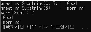 Console.WriteLine($"greeting.Substring(0, 5) : '{greeting.Substring(0, 5)}'");