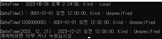 DateTime() | 0001-01-01 오전 12:00:00(24시간 기준 00시) 초기화 DateTime 타입 계산의 배이스 |