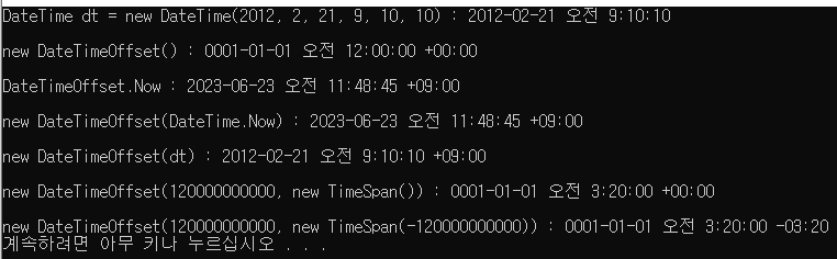 DateTimeOffset(int year, int month, int day, int hour, int minute, int second, TimeSpan offset) | (시간 : 연, 월, 일, 시, 분, 초, 오프셋 시간 : offset)의 값으로 초기화 |